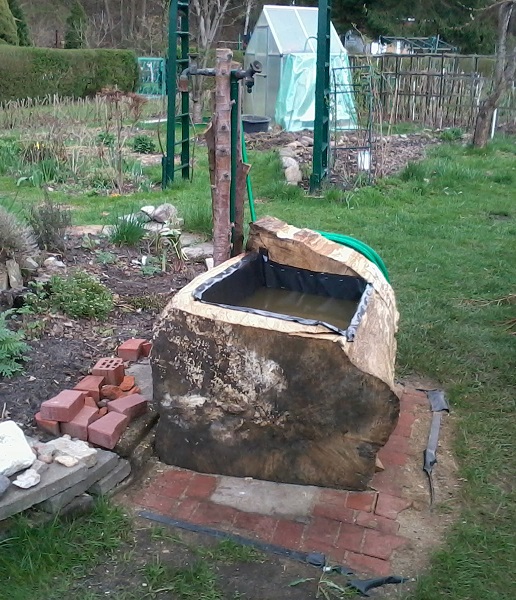 Heute haben wir dann als letzten Schritt das Fass etwa waagerecht justiert und mit Teichfolie ausgekleidet. Und natürlich Wasser reingelassen :DAllen Leuten, die den grünen Gartenschlauch als stilistisch unpassend zu dem rustikalen Behälter empfinden, gebe ich prophylaktisch schon mal recht. An Vorschlägen, einen rusikalen Gartenschlauch betreffend, bin ich allzeit interessiert. Und wenn jemand eine Idee hat, mit welcher Pflanze ich die aufrechten Stangen beranken lassen kann - immer her damit. Für dieses Jahr muss es erstmal ganz profane Kapuzinerkresse sein.