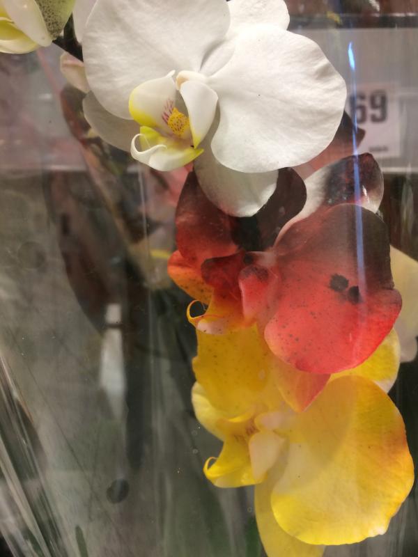Zur EM gibt es Neuigkeiten beim pflanzlichen Grauen: Phalaenopsis in schwarz-rot-goldEindeutig nicht durch Injektion in den Blütenstiel eingefärbt, sondern grauenvoll schlecht angesprüht. Die obersten Blüten waren bei jeder Pflanze weiß.