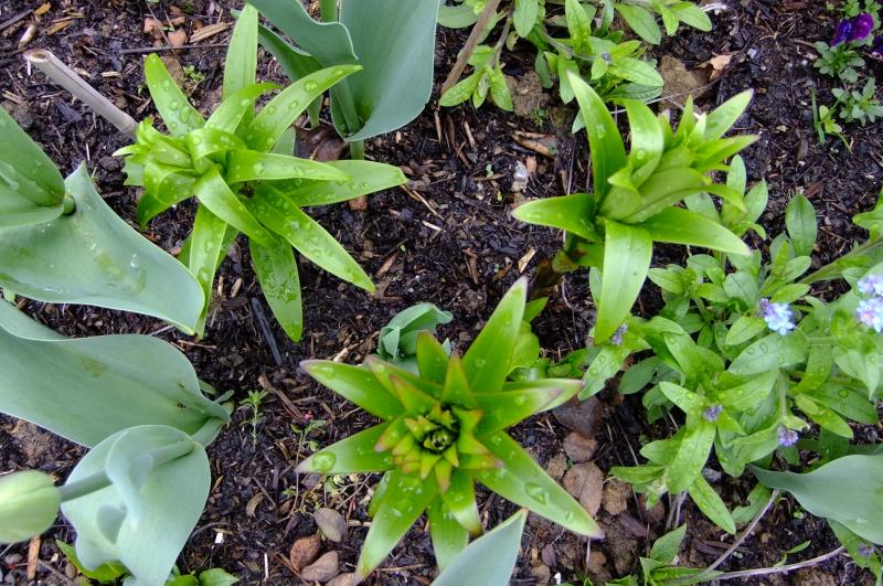 Hier treibt von den im letzten Herbst gepflanzten Lilien erst die Hansonii aus. Von Henryi, Candidum und Regale fehlt noch jede Spur.