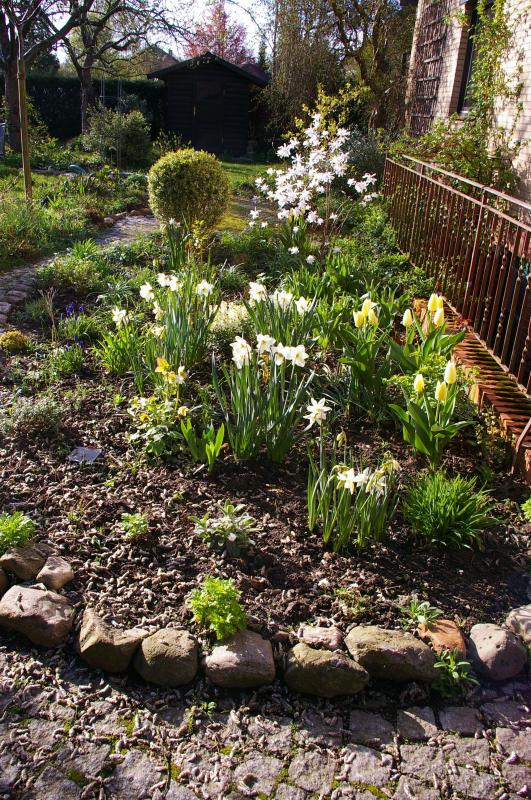 Danke für Eure Beiträge. Ja, es ist zu viel Weiß in dem Beet. In Büchern sehen monochrome Beete immer so gut aus. Aber in meinem Garten gefällt es mir nicht so gut. Ich werde ein Teil der Narzissen und Tulpen herausnehmen und irgendwas Blaues oder kräftig Gelbes dazupflanzen.Die Magnolie bleibt erst mal. Die Blütezeit ist ja sowieso kurz. Ich habe sie auch wegen der Blätter als Kontrast zum Buchsbaum gepflanzt.