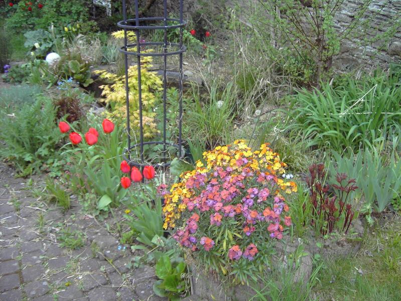 Hier knallt es in einfachem Tulpen-Rot in Verbindung mit Gelb-Orange und Pink-Lila.Hier was ganz Profanes: Jedes Jahr überlege ich, die alten Darwintulpen, die schon lange vor mir da waren, rauszunehmen und durch was Dezenteres zu ersetzen - sooo knallig sollte es doch bei mir nie sein ... Aber wenn ich sie so in der Sonne leuchten sehe, kriege ich doch ziemlich gute Laune.