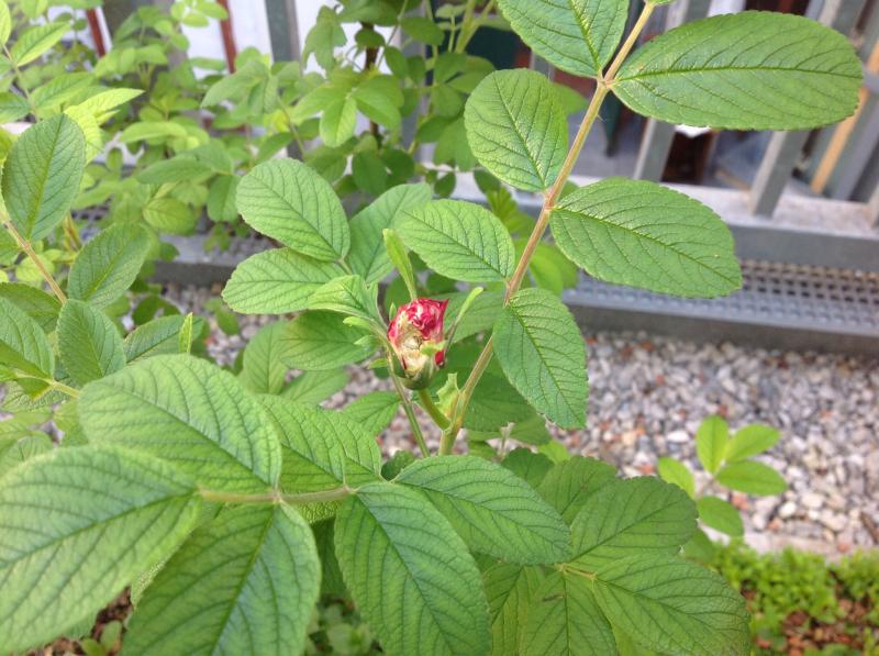 Gerade noch war ich so stolz auf die Knospe der Louise Bugnet, jetzt ist sie halb abgefressen. Wer könnte das denn gewesen sein?