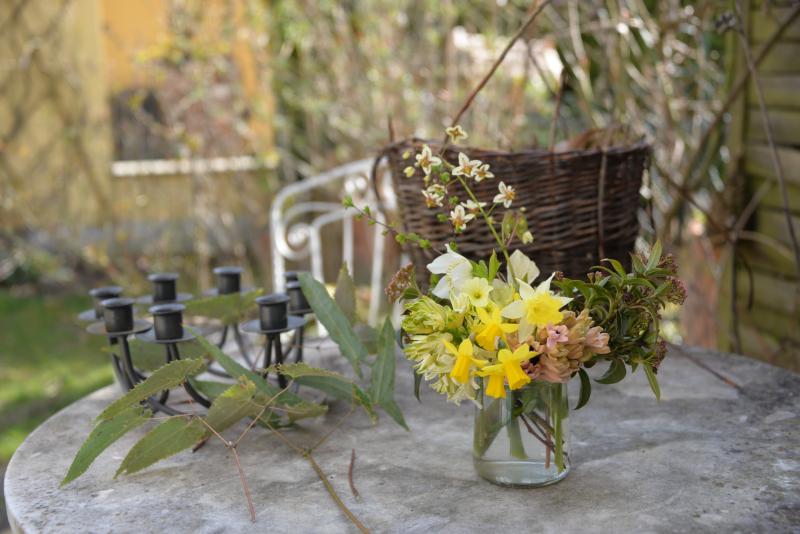 Alles sehr schön: das Arrangement auf dem Terassentisch, der Minimalismus in der tollen Vase und das kleine Sträußlein mit den Bellis.Ebenfalls ein winziger Strauß: