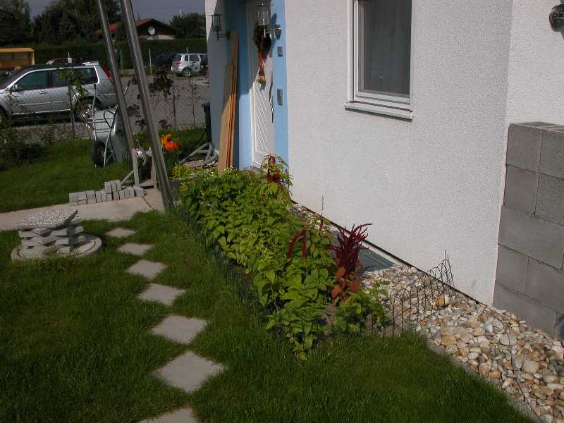 Eh klar, die Hälfe vergessen ???Es ist auf dem Bild nicht ganz esichtlich, aber da ist noch eine junge Blutpflaume (Strauch), die steht ganz rechts außen.Die gehört auch noch miteingebaut.Das Beet soll dann bis direkt an den Fußweg gehen.Bei jetzigen Bild ist das links vom HausWenn's geht keine Rosen, die möchte ich woanders machen.Und in Zukunft wird's neben dem Haus ein wenig Schattiger sein.Ich plane gerade ein Rosengerüst, na vielleicht werden's auch Clematis, mal sehen