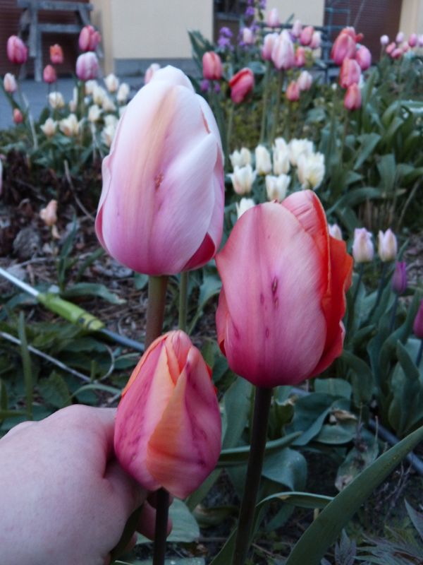 Bislang dachte ich, mir gefielen rosa und orange Tulpen nicht, aber nein, weit gefehlt: Ich hab eindeutig zu wenig Tulpen! Viel zu wenig!Lilo, die orangen Tulpen mit den Euphorbien sind klasse und Chris, dein rosa Beet, wow!