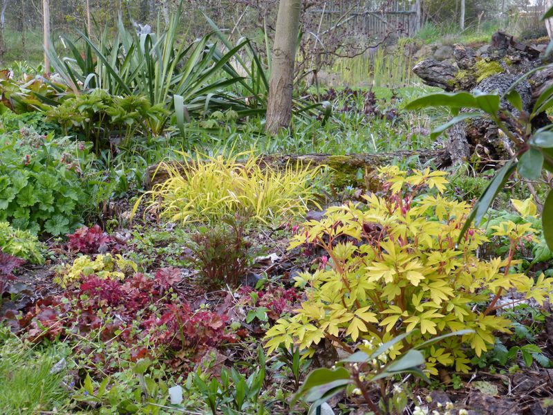 Ja, in der Mitte fehlt ein wenig. Dort hatte ich u. a. einige Tiarella gepflanzt. Die hatten zwar auffälliges Laub, haben aber dafür am Wachtum gespart. Um den Stamm des gelbbunten Liriodendron will ich dieses Jahr noch die Astern entfernen, dann kommen noch weitere Stauden und Physocarpus 'Amber Jubilee' dort hin.