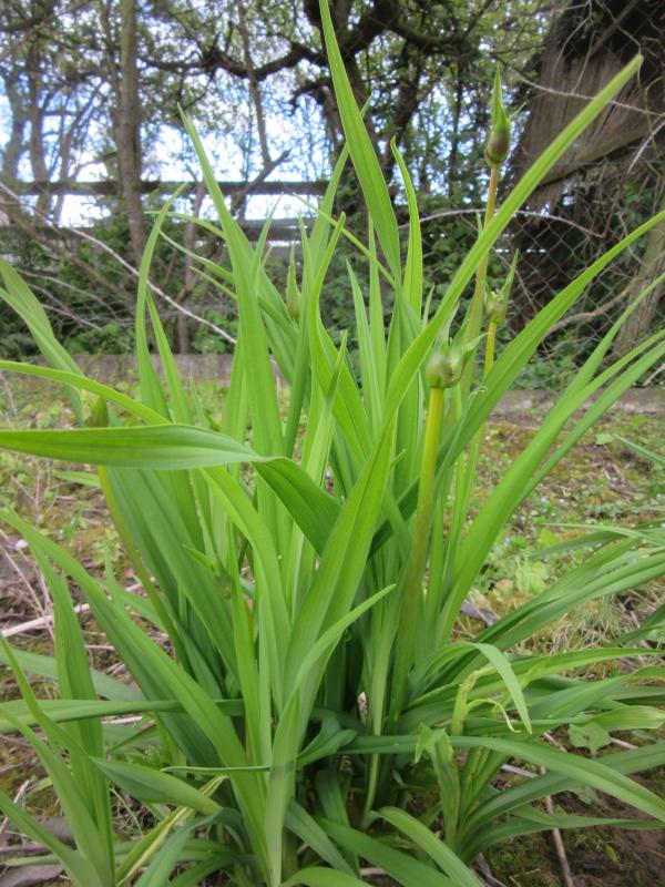 `Gloriana´ hat hier auch Stiele (siehe unten) wobei ich meine, dass sie dieses Jahr sehr früh dran ist. Etwas weiter ist meine zuverlässig Allererste, `Judge Orr´, die sonst immer auf dem "zweiten Platz" sitzende uralte `Brünette´ und eine Namenlose Gelbe, vielleicht was Richtung H. dumortieri sind noch verhaltener, aber auch schon am Schieben. Außerdem fällt mir gerade auf, dass meine `Gloriana´-Pflanze irgendwie für ihr Alter noch ziemlich schmal ist, vielleicht verhungert...