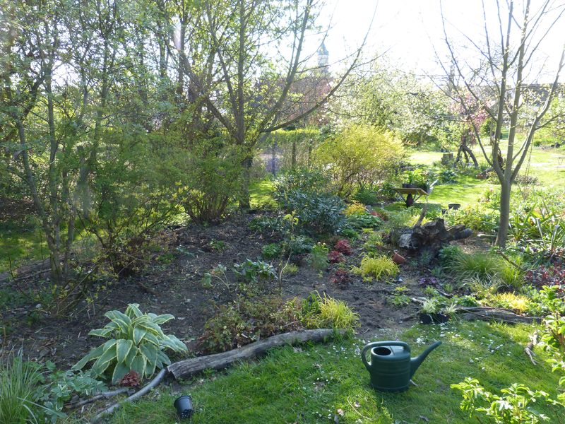 Heute gab es - eher ungeplant - eine satte Beeterweiterung. Hinter den Stauden kamen je etliche Sträucher. Spirea, eine Hortensie 'Endless Summer', die im Winter komplett runtergefroren ist, ein grauslich rot blühender Rhodendron, eine kleine Deutzia, die direkt am Beetrand den Blick in selbiges versperrte und ausufernder Cornus. Eigentlich wollte ich heute nur Geum und Brennnesseln jäten. Dann machte ich mich aber auch an die Gehölze. Deutzie und Rhodo sind umgepflanzt, ausläufernde Spirea entfernt, das große Exemplar aufgeastet, der Cornus gestutzt. Und schon ist da plötzlich jede Menge neue Beetfläche.