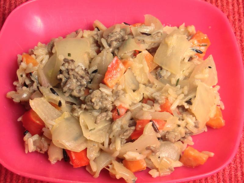 Gestern machte die große Tochter für uns gefüllte Zwiebeln. Heute gab es die Reste als Zwiebelreis (Zwiebeln, Reis, Wildreis, Paprika, Hackfleisch, Möhren, Rosmarin).