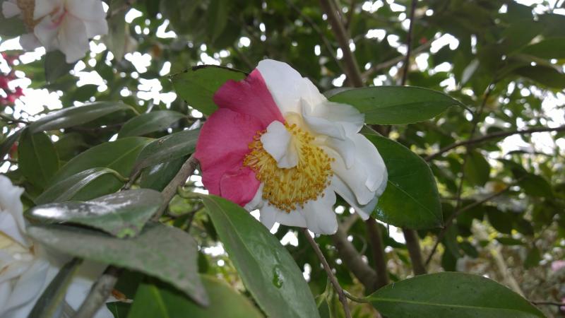 Camellia japonica Eximea,Roger Hall, Elegans (die beiden ersteren sind sehr ähnlich und wirken wie eine Camellia)Photographiert vor dem Dauerregen. Jetzt zumindestens Elegans ein Bild des Jammers (braune Blüten)