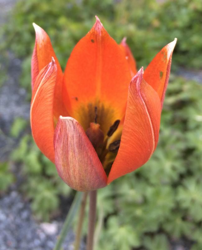 Ebenfalls mit eher dezenter Farbgebung - Tulipa whittallii. Hier wurde sie zu Hunderten in einem städtischen Kiesbeet verwendet; ein Gesamtfoto war leider nicht zu machen, da die Ecke vorhin in gleißender Sonne lag.Ja, die Blattläuse haben die Schönheit auch schon entdeckt.