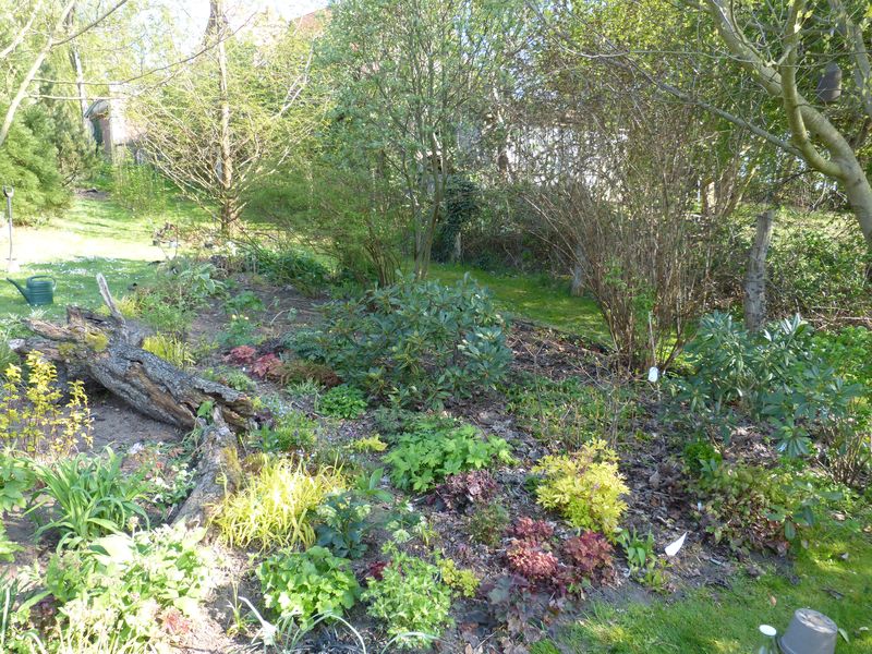Heute gab es - eher ungeplant - eine satte Beeterweiterung. Hinter den Stauden kamen je etliche Sträucher. Spirea, eine Hortensie 'Endless Summer', die im Winter komplett runtergefroren ist, ein grauslich rot blühender Rhodendron, eine kleine Deutzia, die direkt am Beetrand den Blick in selbiges versperrte und ausufernder Cornus. Eigentlich wollte ich heute nur Geum und Brennnesseln jäten. Dann machte ich mich aber auch an die Gehölze. Deutzie und Rhodo sind umgepflanzt, ausläufernde Spirea entfernt, das große Exemplar aufgeastet, der Cornus gestutzt. Und schon ist da plötzlich jede Menge neue Beetfläche.