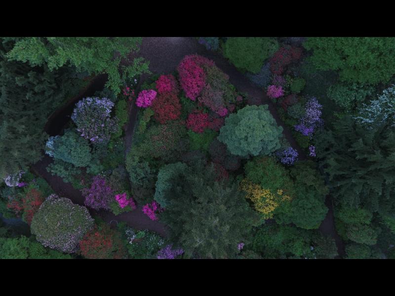 Etwa am selben Tag... Das blauviolette sind Russatum - Hybriden, das Magentazeug links unter der Mitte Rh. reticulatum, der rote Fleck links 'Taurus', die hellen rechts 'Jacksonii', das hellrosa oberhalb der Mitte Rh. campanulatum und das pinke Zeug auf ca. halb elf aufblühende Japanische Azaleen.