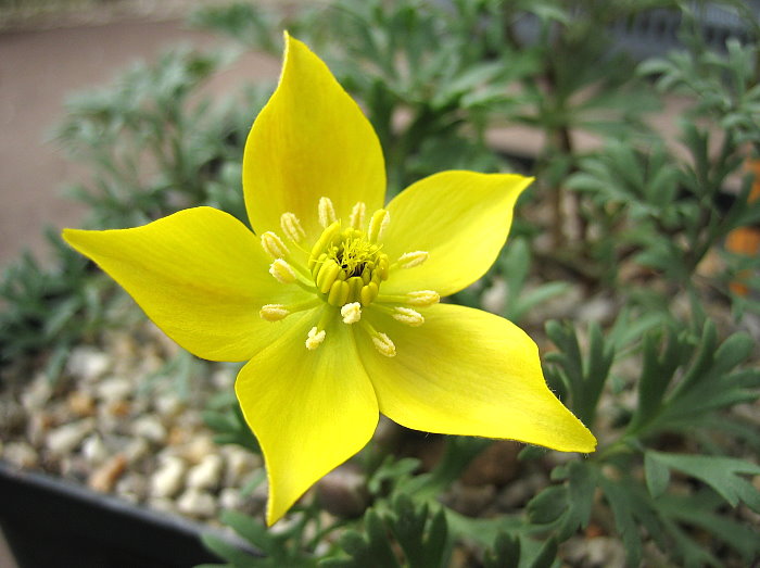nachdem die sonne heute, wenn auch nur kurz, das gewächshaus auf ~20° aufgeheizt hat, sind die blütenknospen einer niedrig wachsenden anemonen species aufgegangen... anemone petiolulosa aus dem pamir/tienshan-gebiet. erhalten habe ich sie als knochentrockenen knubbel, der aussah wie ein stück trockenes treibholz. ich wusste zwar, dass diese art im somer einzieht + trocken stehen will, aber sooo trocken