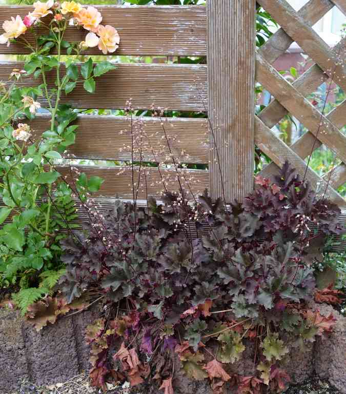 Ich habe ein Bild gefunden. Sowohl Rose als auch Heuchera präsentieren sich nicht in Bestform, das geht im Beet besser.Aber um eine Vorstellung von der Kombi zu bekommen reicht es.Es handelt sich hier übrigens um die Sorte 'Purple Petticoats'Zur Heuchera konnte ich meine Liebe noch nicht so entdecken.. Etwas großlaubiges wäre aber schon was, das ist gut fände..