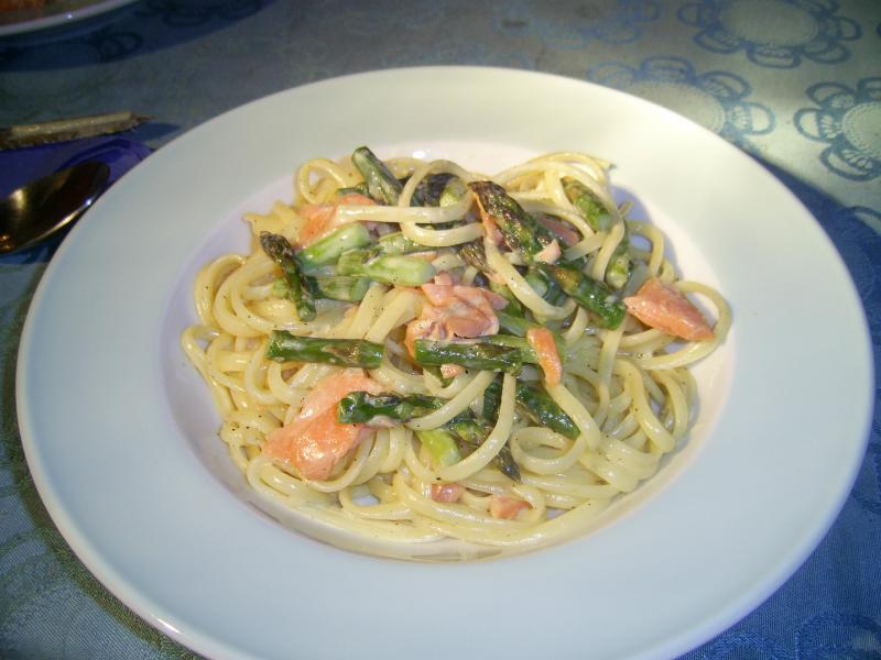 Am Donnerstag hatten wir Linguine mit gebratenem grünen Spargel und Räucherlachs.