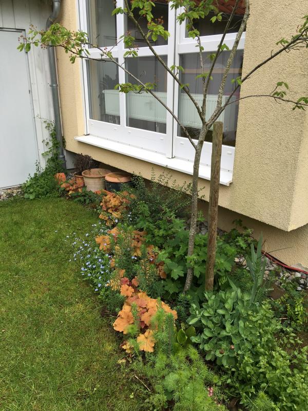 Nur um die Ecke, vor dem Eßzimmerfenster ist es bunt - gegenüber der Hecke und des neuen schmalen Beets, bei dem mich neulich u.a. Enaira so gut beraten hat: Heuchera Caramel irgendwas und das erste blühende Geranium (hmm, sieht man gar nicht auf dem Foto