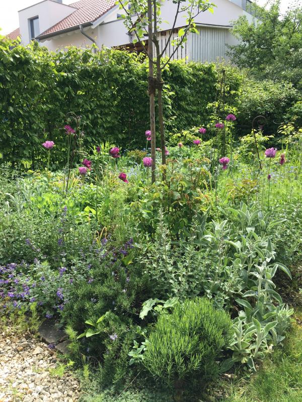 Seit Jahren stöbere ich hier und staune ich über eure Gärten. Heute traue ich mich auch mal, einen kleinen Einblick zu geben, nachdem der Garten nach der Rasenmonotonie der ersten Jahre endlich als Garten erkennbar wird. Es ist nur ein kleiner Gartens (hinter dem Haus vielleicht 130qm) einer DHH mitten in einem "Neu"-Baugebiet, völlig ohne schöne Ausblicke auf Landschaft. Das Foto zeigt den Farbklecks in Lila vor der Terrasse; der Rest des Gartens ist, von ein paar Thymianen, Schwertlilien und dem Flieder abgesehen gerade eher grüne Hölle, in Erwartung demnächst explodierender Rosenblüten etc.