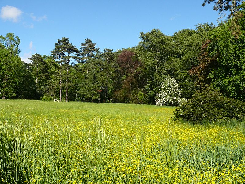 Blick zum alten Baumbestand und der unglaublichen Wiese, in der rote Tulpen (hier nicht sichtbar) Akzente setzten.