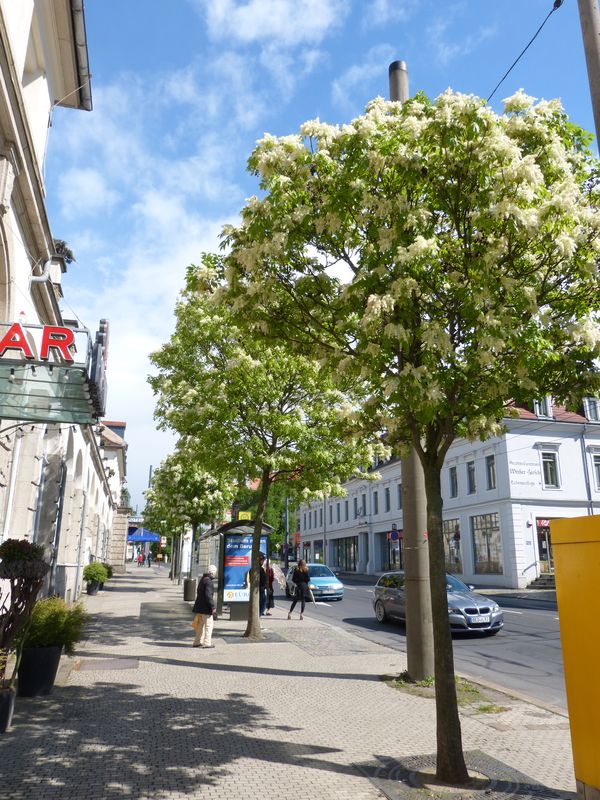 Dann ist der Straßenbaum in Dresden wohl Fraxinus ornus, jedenfalls aber eine Blumenesche.Ich merke an den übrigen Fotos gerade, dass das gefiederte Laub nicht zu Chionanthus zu passen scheint.