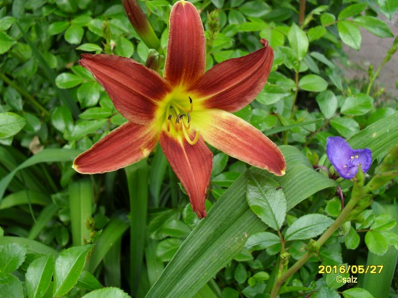 Hier hat als erste Taglilie meine vermeintliche 'Maikönigin' die erste Blüte geöffnet.So spät war sie seit Beginn meiner Aufzeichnungen vor 10 Jahren nur einmal, nämlich 2011.Insgesamt scheint sich das zu wiederholen, was ich schon bei den Strauchpaeonien beobachtet habe: Ganz andere Reihenfolge als sonst.Nach den ausgesprochen frühen Arten ist sonst bei mir 'Orange Prelude' die erste. Bei der sind bislang kaum Knospen erkennbar.Dafür schiebt vor allem 'Reverend Traub' fleißig Stiele.