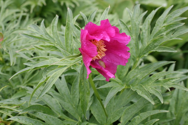 ja, genauso eine wie du sie beschreibst habe ich auch mal als P. mascula ssp. triternata bekommen...bestimmt schon über 15 jahre her. leider durch päonienfäule fast verloren. die wurzelstrünke habe ich letztes jahr ausgegraben, nachdem ich ein paar spärliche austriebe in meinem "pflanzendschungel" gefunden hatte. einige dieser wurzelstücke treiben heuer wieder mit kleinen trieben durch. vielleicht gelingt es mir, sie wieder aufzubauen. hier fotos aus vergangenen zeiten...blätter wirken bläulichgrün bereift + die blattränder sind leicht gewellt. leider habe ich damals in unkenntnis der wichtigen merkmale keine details fotografiert.Seltsam bei dieser Pflanze sind diese länglichen Blätter, die so eigenartig bewegt herunterhängen. Die Oberfläche ist matt, fast graufilzig.