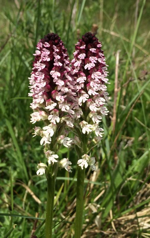 Zusammen mit dem gleichzeitig blühenden Brand-Knabenkraut (Neotinea ustulata - links im Bild) entsteht als Hybride das Dietrich-Knabenkraut (N. x dietrichiana). Bei diesem Exemplar bin ich noch nicht ganz sicher...