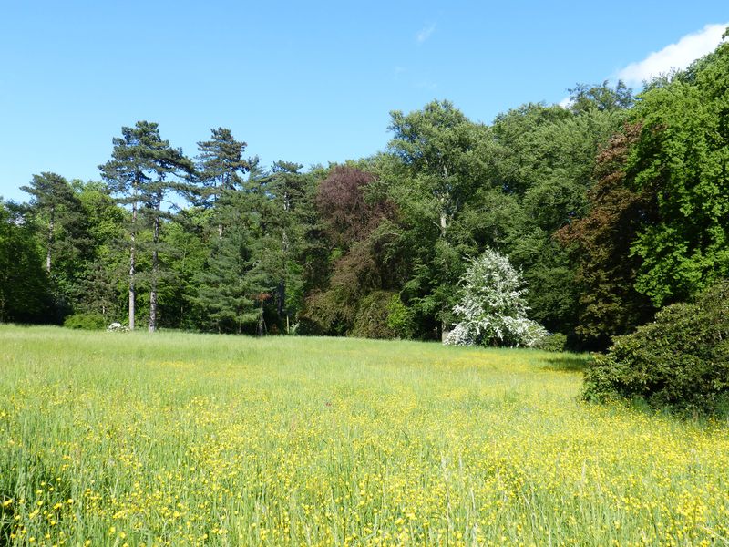 Blick zurück auf die Halesia, den Cercidiphyllum und im Hintergrund eine große Magnolia soulangeana.