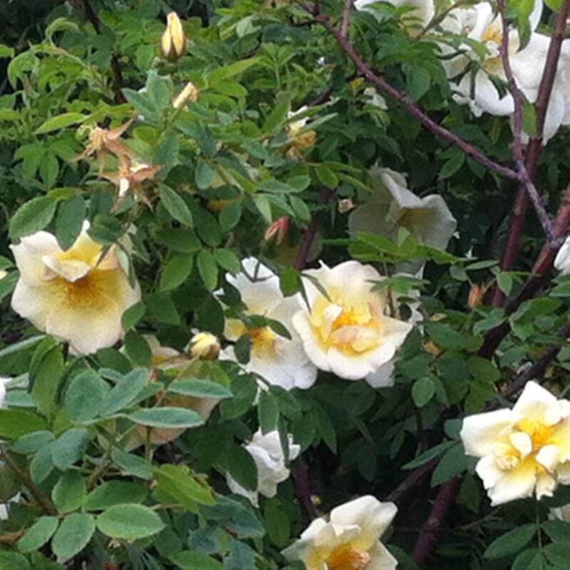 Diese Rose (Nellyn Tytär), von Pirjo Rautio aus Finnland gezüchtet, hat mir jahrelang immer so gut gefallen auf ihren Bildern und ich habe mehrfach Reiser von ihr bekommen, aber es hat einfach nicht geklappt mit der Veredelung. Dann aber, eines Tages, doch.Ich finde die so wunderbar zart in der Zeichnung! Blüht aber bisher auch nur im Container auf der schwarzen Stellfläche, im Park sind die Rosen immer noch nicht so weit. Bis auf den diesjährigen Sieger Marie Bugnet, da gab es gestern die erste Blüte im Rosenpark.