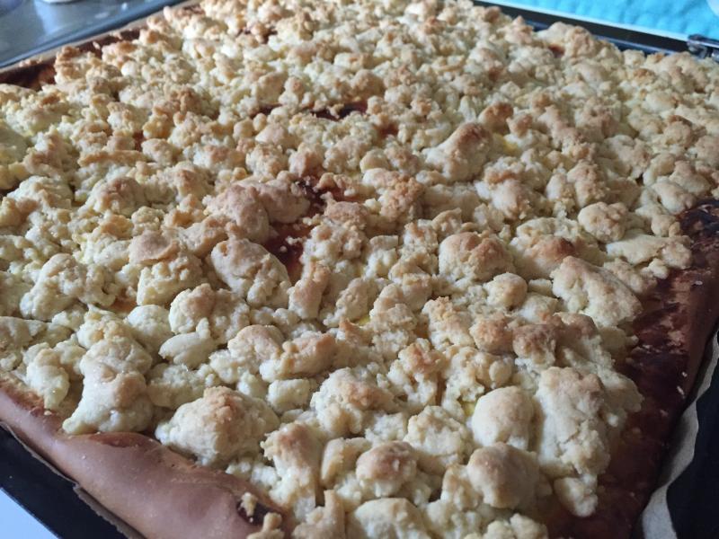 Der Streußelkuchen sieht sehr verlockend aus. Bei uns am Hundsplatz gab es gerade Nudelsalat mit Karotten, Grünspargel, Würstchen und viel frischen Kräutern. Danach eine Erdbeer-Bisquitrolle