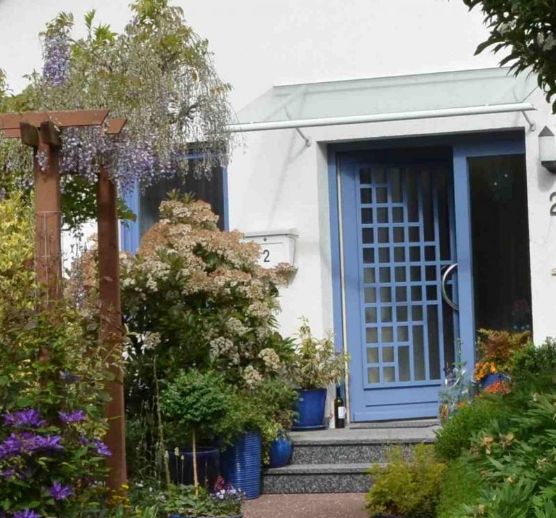Hier sieht man es noch besser.Ausschnitt aus einem anderen Bild, deshalb ist die Qualität nicht so toll.Ende Mai, links der blühende Strauch. Hier sieht man auch ganz gut, warum der Briefträger Probleme bekommt...