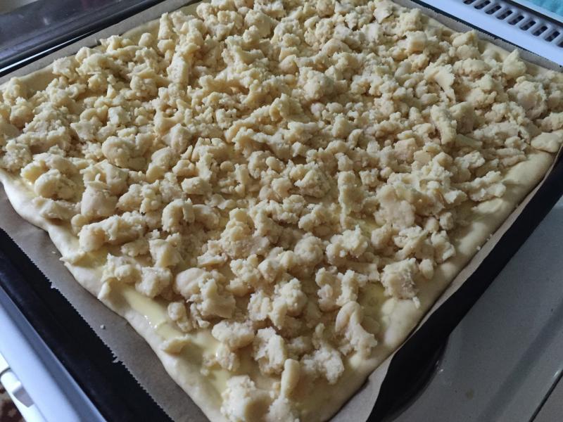 Der Streußelkuchen sieht sehr verlockend aus. Bei uns am Hundsplatz gab es gerade Nudelsalat mit Karotten, Grünspargel, Würstchen und viel frischen Kräutern. Danach eine Erdbeer-Bisquitrolle