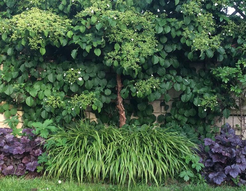 Mutet irgendwie japanisch an. Die Kletterhortensien laufen zur Hochform auf.