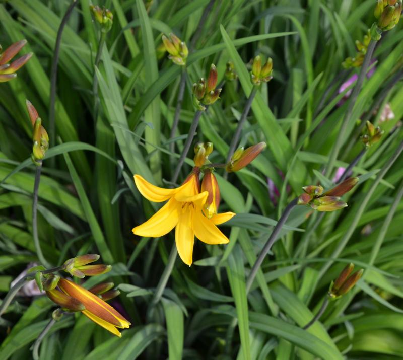 Hier hat als erste Taglilie meine vermeintliche 'Maikönigin' die erste Blüte geöffnet.So spät war sie seit Beginn meiner Aufzeichnungen vor 10 Jahren nur einmal, nämlich 2011.Insgesamt scheint sich das zu wiederholen, was ich schon bei den Strauchpaeonien beobachtet habe: Ganz andere Reihenfolge als sonst.Nach den ausgesprochen frühen Arten ist sonst bei mir 'Orange Prelude' die erste. Bei der sind bislang kaum Knospen erkennbar.Dafür schiebt vor allem 'Reverend Traub' fleißig Stiele.