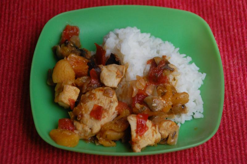 Aprikosenhuhn (Huhn, Aprikosen, Tomaten, Zwiebeln, Gartenknoblauch, Lauchzwiebeln, Champignons, Ingwer, Rosmarin, S&P, Zimtrinde, Chili) mit Basmatireis