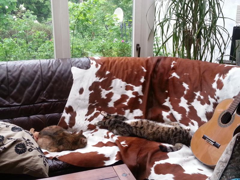 Die zwei genießen es jetzt wirklich, dass sie endlich wieder im Haus sind, eine bequeme Couch haben, Essen und Trinken bereit steht und es trocken ist...