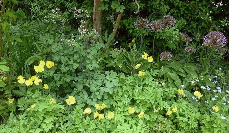 quasi über nacht dominiert auf einmal meconopsis cambrica den garten und löst das blaue "elend" (vergissmeinnicht) ab.