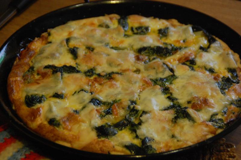 Spinat-Spargel-Quiche (Mürbeteigboden mit Spinat aus eigener Ernte, Spargel, S&P, Zwerghuhneier, Sahne, Semmelbrösel, der letzte Rest vom überreifen Brie, Käsescheiben)