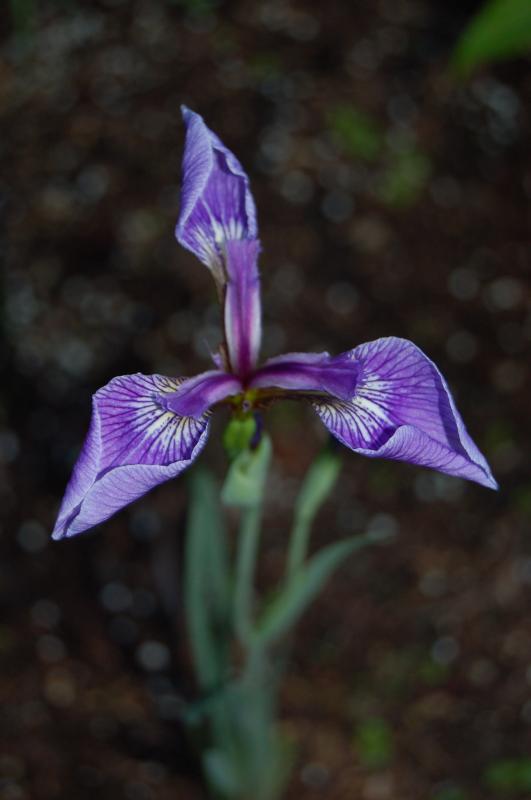 Iris sibirica, die Erste. Das Schild haben die Amseln auf dem Gewissen, die Sorte muss ich erst noch suchen ...