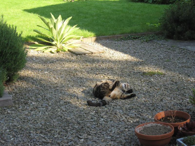Auch wir drücken die Daumen, dass die nächtliche Schlägerei ohne Blessuren ausgegangen ist...Für Coquine ist das Leben so derart anstrengend (man kann vor lauter Gezwitscher und Getue überall überhaupt gar nicht in Ruhe schlafen), dass man schon mal beim Rückenschrubbeln auf dem Kies mal kurz einnicken kann