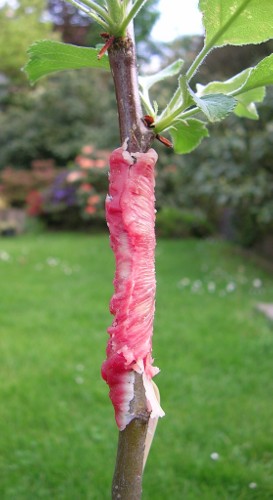Die Mispeln wachsen gut weiter. Diejenigen, an denen nur Blütenknospen treiben, halten sich natürlich etwas zurück,Das vulkanisierende Klebeband (selbstverschweißend) reist, zumindest wenn man es fest wickelt, relativ früh auf. Ich hab allerdings auch Streifen verwendet, die nur ca. 5mm breit waren. Wenn man das Band der Länge nach nicht teilt, hält es bestimmt mehr aus.Hier noch zwei exemplarische Bilder.