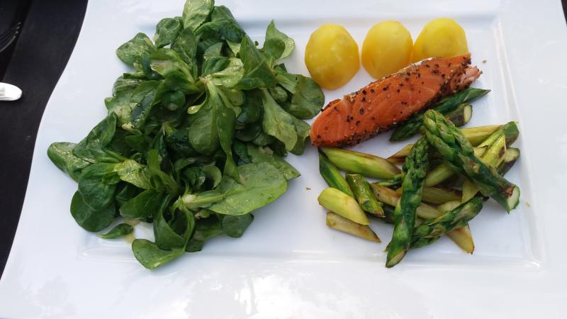 ...gebratener Grüner Spargel mit Kartoffeln und Stremellachs, dazu Feldsalat
