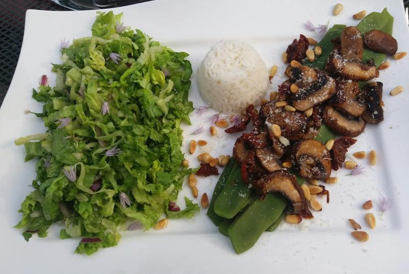 ...und heute Stangenbohnen mit gebratenen Champignons, Zwiebeln, Knoblauch, getrockneten Tomaten, gerösteten Pinienkernen und Parmesan, dazu Reis und Salat.