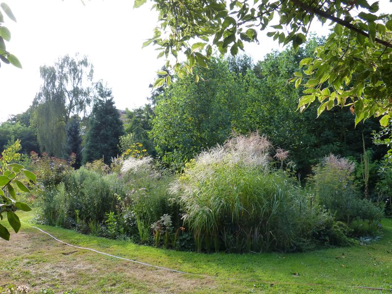 Aktuell sieht es ziemlich voll aus. Die Verbascum werde ich deutlich ausdünnen, nur einige für die Struktur und Aussaat stehen lassen. Die Miscanthus und Astern kommen ketzt langsam auf Höhe.