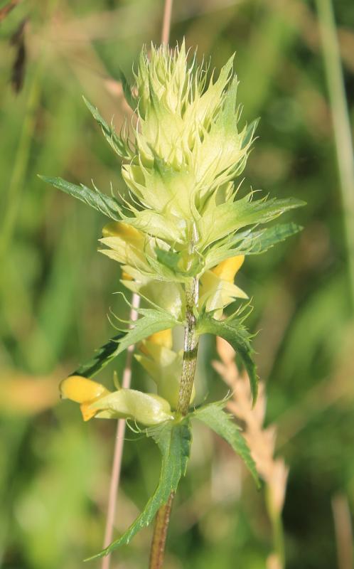Außerdem habe ich entdeckt, das ich in einem kleinen, trockeneren und magerereren Teil der Wiese, in dem ich aus einem Trockenrasen gesammelte Klappertopfsamen gesät hatte, nicht nur den Zottigen Klappertopf (Rhinanthus alectorolophus) sondern auch zwei andere Klappertöpfe, vermutlich Grannen-Klappertopf (Rhinanthus glacialis), siehe Bild. Ich bin gespannt, ob sich dieser etwas elegantere Klappertopf bei mir auf Dauer etablieren kann.
