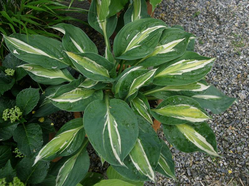 Ok, dann steck das Schild zu der Hosta mit dem breitesten weissen Rand.