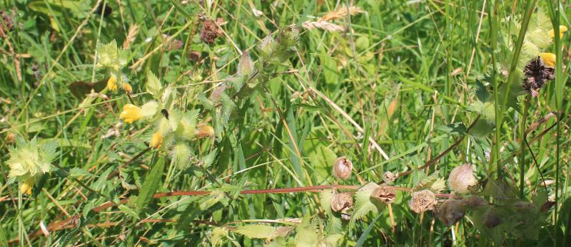 Der Zottige Klappertopf (Rhinanthus alectorolophus) lässt sich wirklich sehr gut ansäen und man sieht schnelle Erfolge, da er einjährig ist. Von den zweijährigen Wiesenblumen die ich 2015 gesät hatte, konnte ich bis jetzt noch keine Pflanzen finden. Hier ein leider bei Nieselregen aufgenommenes Übersichtsbild eines Teils meiner Wiese. Fast alle hellgelben Punkte darauf sind Zottiger Klappertopf (Rhinanthus alectorolophus). Den Baumreihen entlang wurde schon gemäht, genauso im Vordergrund selektiv die "blütenfreien" Bereiche. Dieser Teil im Bild hier ist der "grasigste", in einem anderen Teil wachsen im Vergleich schon deutlich mehr blühende Kräuter. Das jetzt noch stehende Gras mit den Klappertöpfen werde ich erst in ein paar Wochen mähen, wenn der Klappertopfsamen zu einem großen Teil schon reif und ausgefallen ist. Für andere, die auch Klappertopf ansiedeln wollen, ist vielleicht interessant zu wissen, dass ich ca. 1l Klappertopfsamenkapseln letztes Jahr für diese Fläche gesammelt und ohne weitere Verarbeitung gesät habe. Dieses Jahr habe ich einen noch etwas früher blühenden Bestand von Zottigem Klappertopf entdeckt und etwa eine Einkaufstüte voll (ca. 10l) Samenstände geerntet und gesät. Ich hoffe, das dieser ca. 2-3 Wochen früher blühende und reifende Klappertopf besser zu unserem normalen Mähtermin Ende Juni passt.