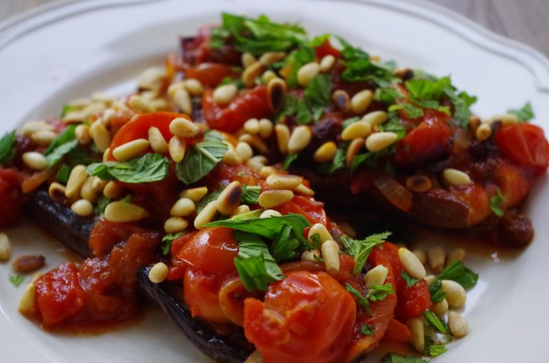 Könnte dazu total crossculturemäßig diese Variation von Imam bayildi mitbringen, die es hier gerade gab. Etwas süßsauer, mit Balsamico, Rosinen und Minze (und meiner Spezialität, einseitig verschreuten Pinienkernen