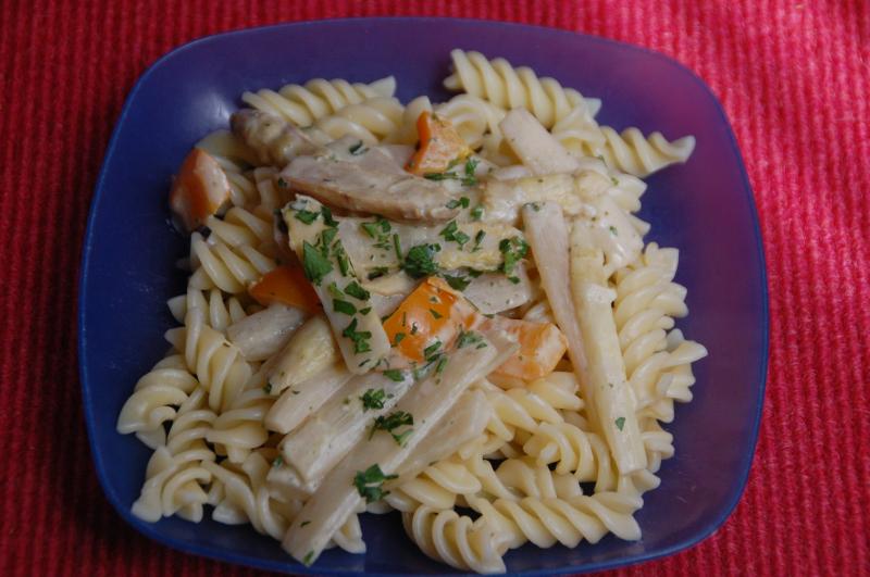 Spirelli mit Spargel-Paprika-Frischkäse-Soße und Petersilie