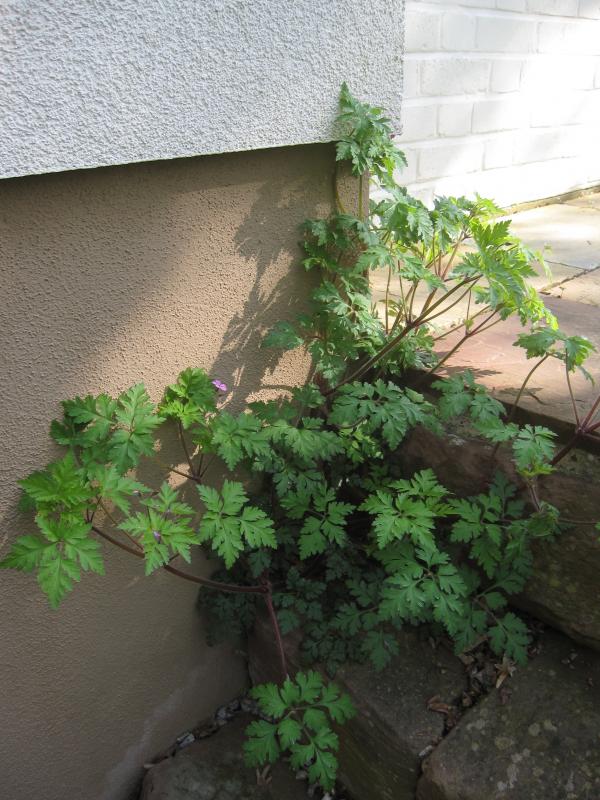 Und gegenüber an der Treppe Geranium robertianum (glaube ich), auch seit zwei Jahren...